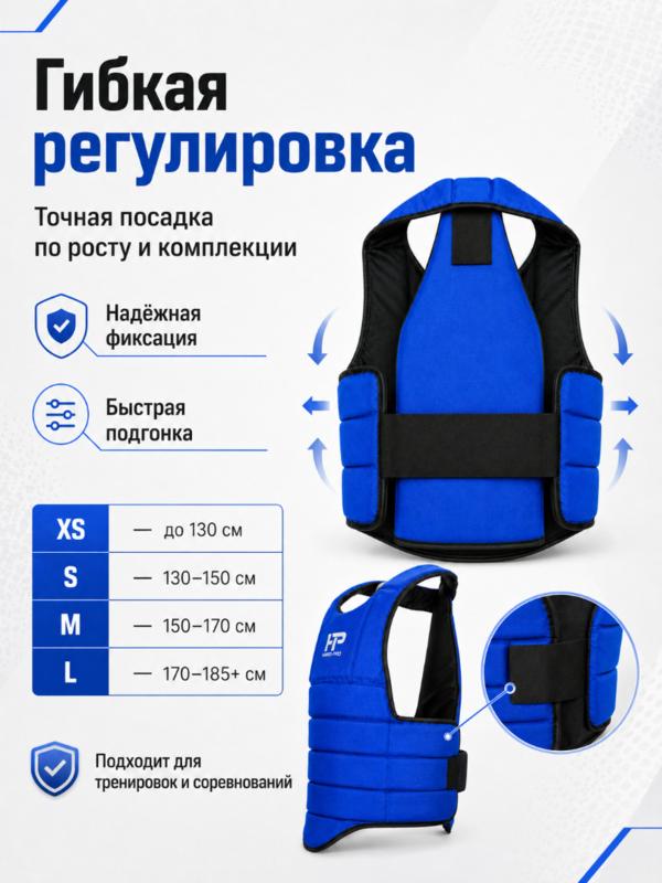 Жилет защитный «Черепаха» HARD-PRO RBG-2PR Защитный жилет «Черепаха» разработан специально для тренировок и соревнований по армейскому рукопашному бою (АРБ), рукопашному бою, карате, муай-тай, ушу саньда и другим видам единоборств. Эргономичная конструкция надёжно защищает живот, бока и спину, сохраняя при этом свободу движения при выполнении ударной и борцовской техники. Система гибкой регулировки позволяет точно подогнать жилет под рост и комплекцию спортсмена. Материал: прочный и износостойкий капрон. Наполнитель — изолон толщиной 8 мм, обеспечивающий эффективное поглощение ударов. Размеры: XS — до 130 см роста S — 130–150 см M — 150–170 см L — 170–185 и более см Преимущества: Лёгкий и удобный в носке Защищает ключевые зоны тела Подходит для тренировок и соревнований Быстрая регулировка по размеру и фиксации